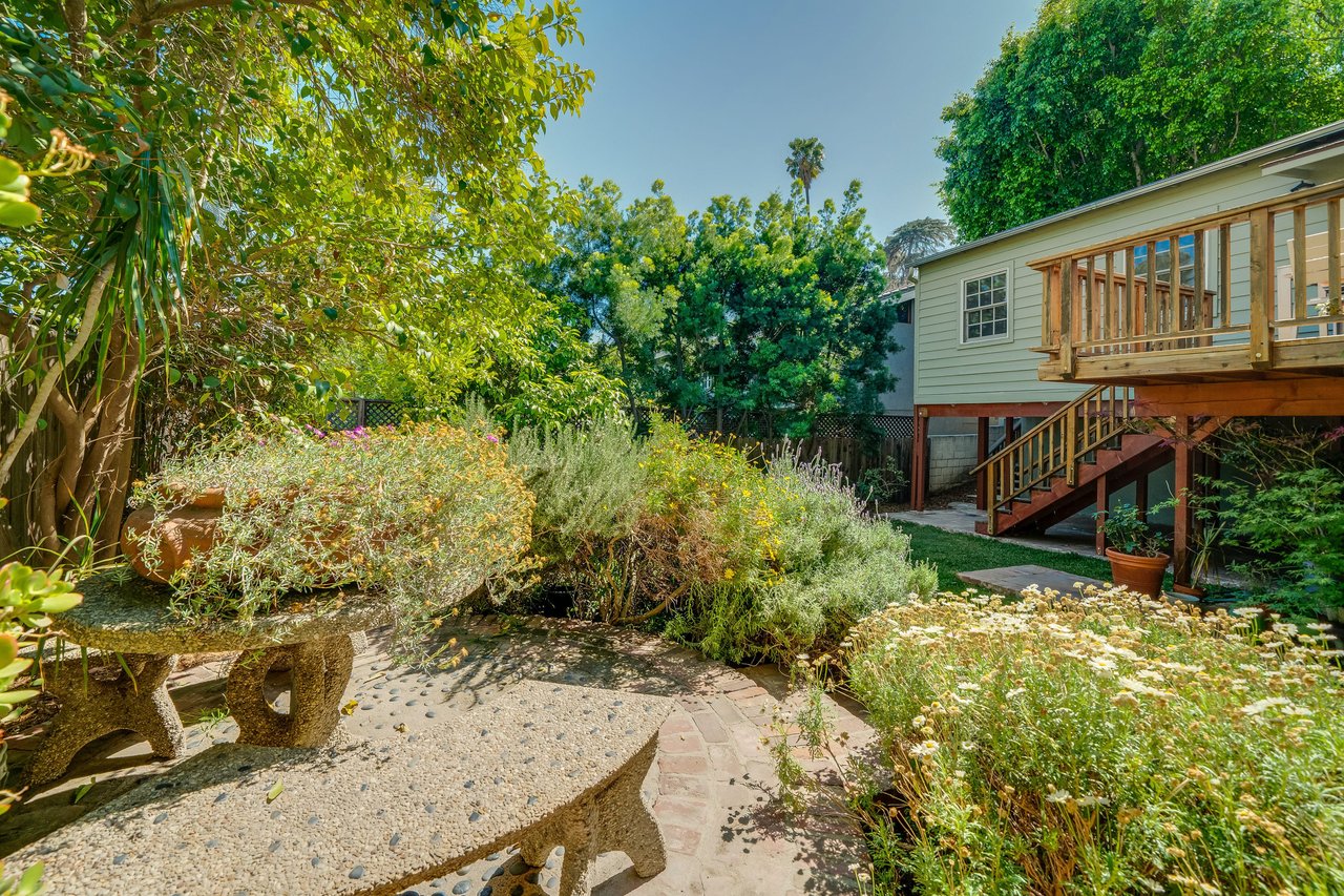 Behind a lush ficus hedge, this delightfully bright & fresh gated traditional in the Hollywood Manor offers classic original details such as hardwood floors, wainscoting, paned wood windows & period light fixtures. Both the formal living & dining rooms open to a deck that provides a peaceful spot to enjoy the views of the hills as well as a perch for surveying the thriving garden & lawn below. The sunny kitchen is outfitted with stainless steel appliances & stone counter tops while both bathrooms have been tastefully remodeled including the main en suite bedroom with French doors to a private balcony. A study off of the dining room overlooks the flourishing private front patio with plenty of space for al fresco dining/lounging under the epic willow tree. A bonus room below the living room is great for storage or a potential future gym/recording studio/wine tasting room. Freshly painted inside & outside w/ a 3 yr old roof, this sweet retreat tucked away in Lake Hollywood is an ideal work from home or escape to home property.