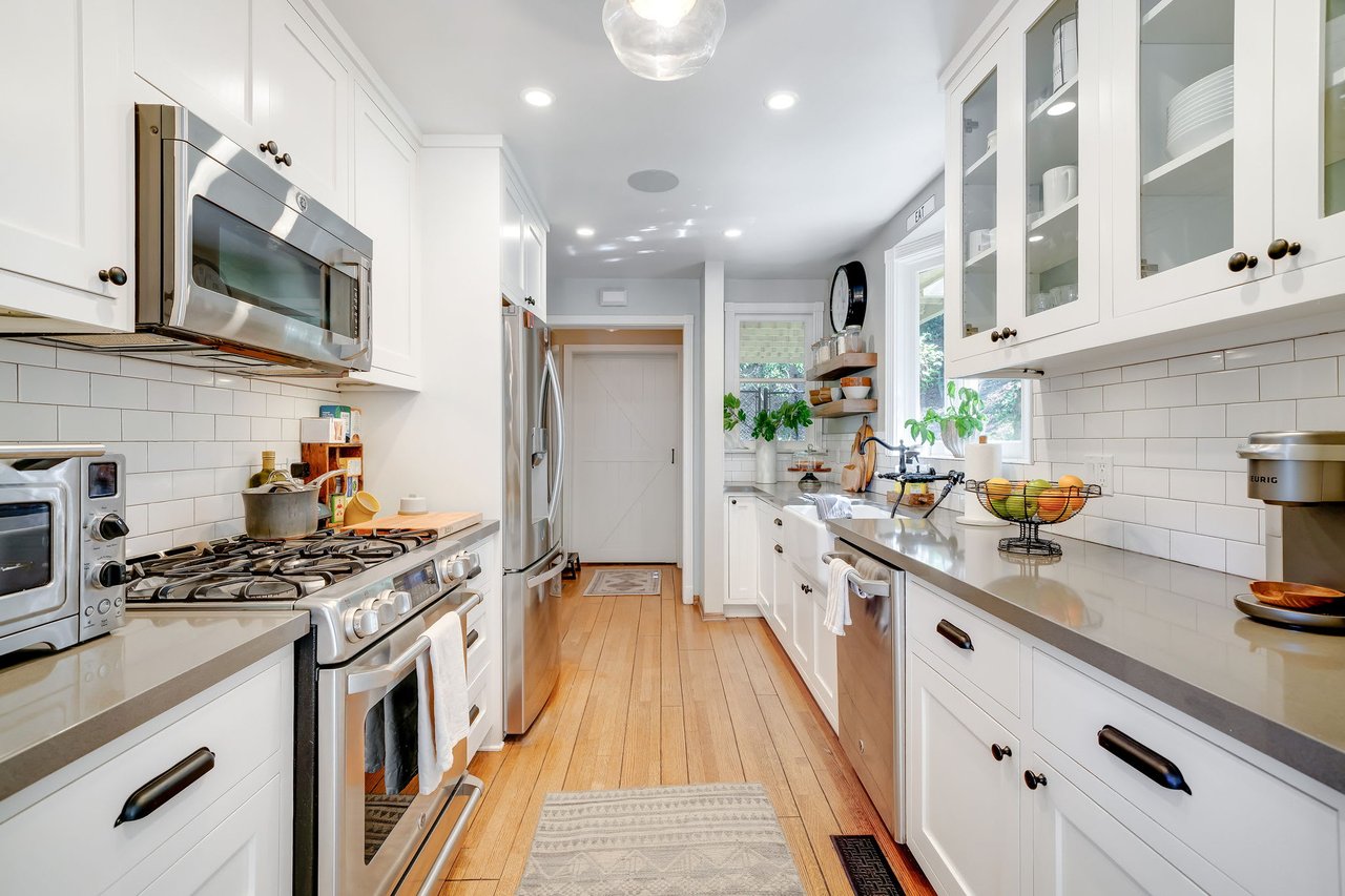 The first floor of the charming 1936 traditional encompasses a formal living room with a mantled fireplace, a sunny, updated galley kitchen with breakfast bar & window seat for sipping coffee, a cozy office/study with fireplace & built-in shelving, powder room and a dining area that opens via French sliders onto the terrace & pool area with newer decking, built in gas BBQ, fridge, gas fire pit & 3 seating areas for guests to enjoy during large gatherings.